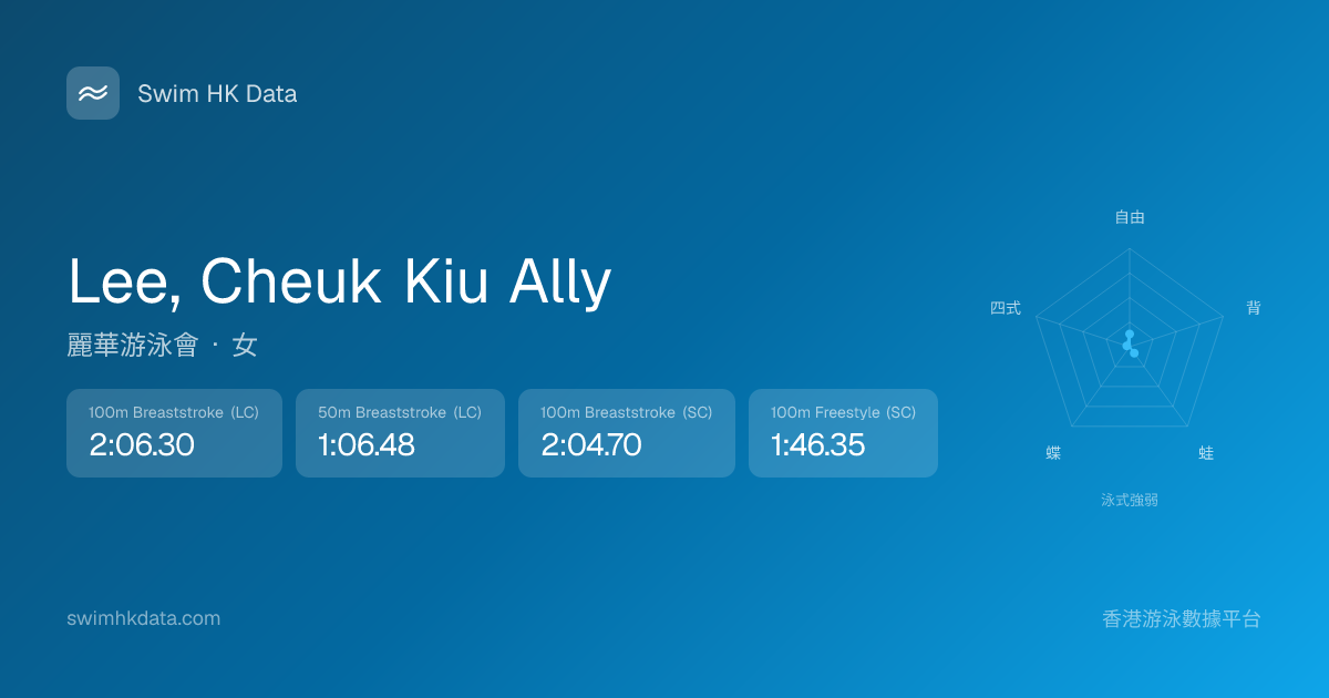 此圖表根據你所有比賽成績計算,顯示你在各泳式的相對強弱,僅供參考。繼續努力,每一次練習都會讓你更快更強!💪