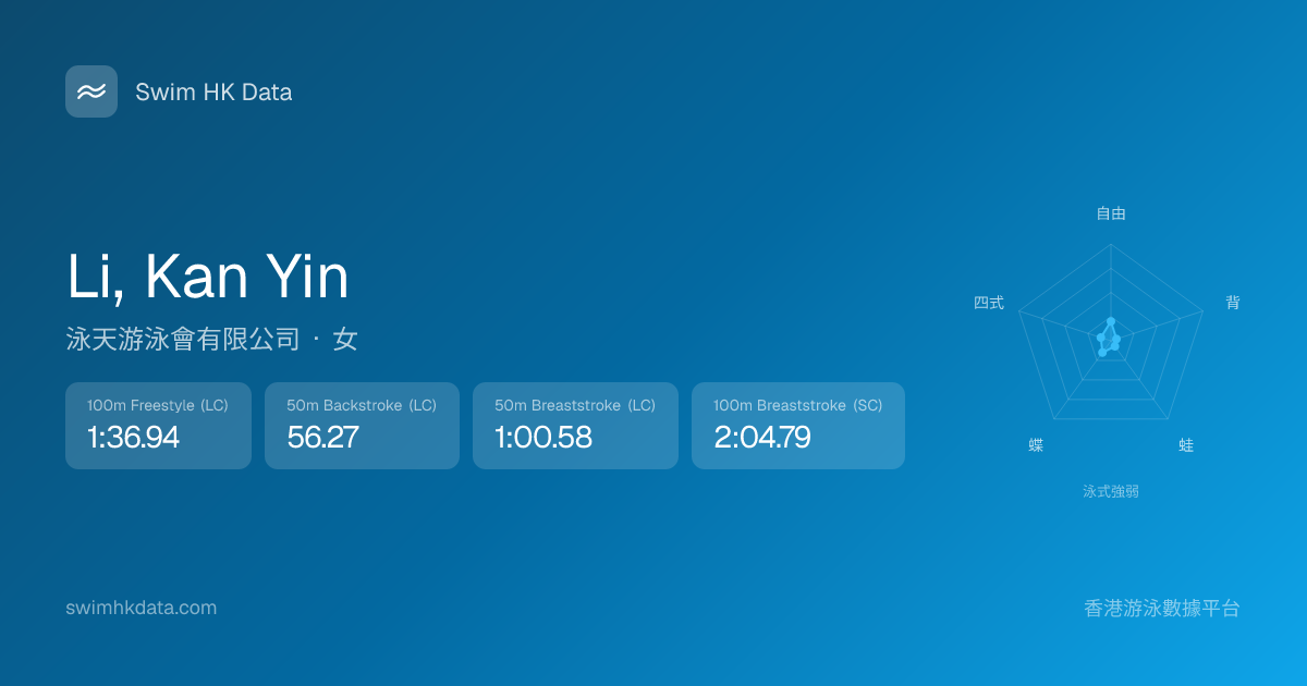 此圖表根據你所有比賽成績計算,顯示你在各泳式的相對強弱,僅供參考。繼續努力,每一次練習都會讓你更快更強!💪