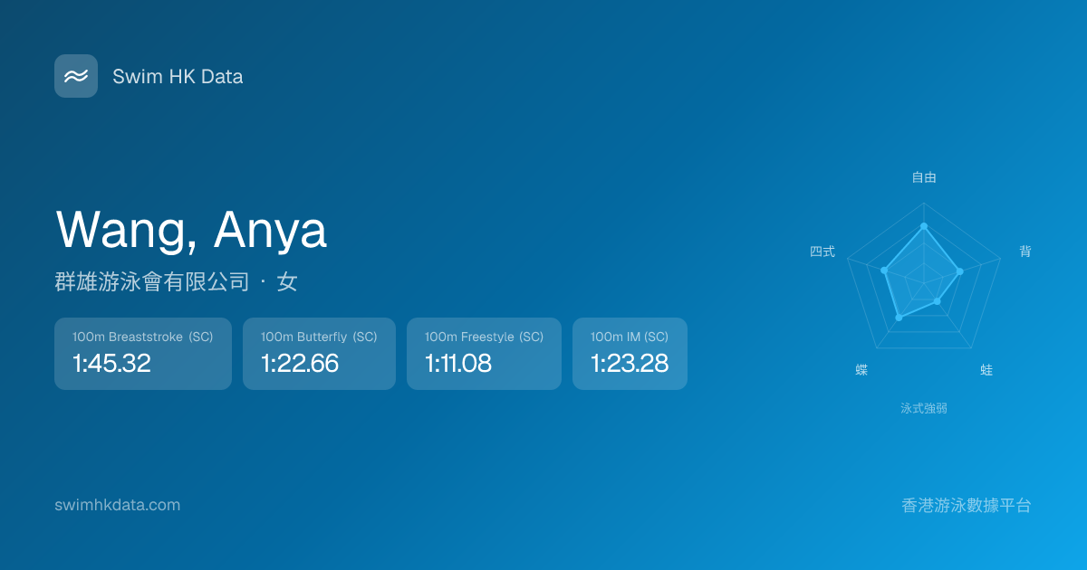 此圖表根據你所有比賽成績計算,顯示你在各泳式的相對強弱,僅供參考。繼續努力,每一次練習都會讓你更快更強!💪