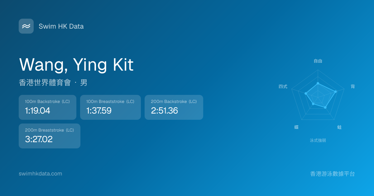 此圖表根據你所有比賽成績計算,顯示你在各泳式的相對強弱,僅供參考。繼續努力,每一次練習都會讓你更快更強!💪