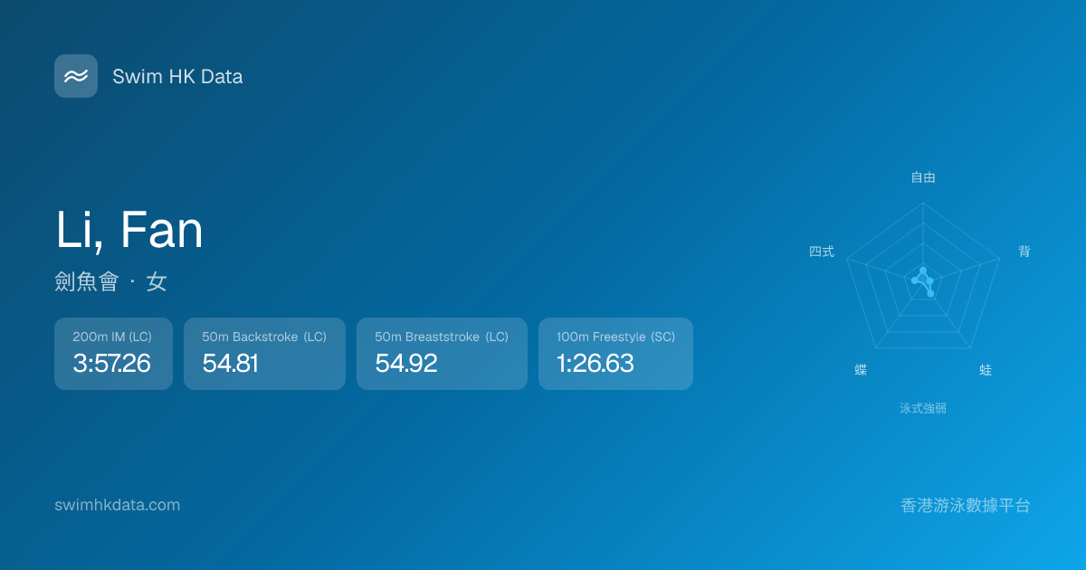 此圖表根據你所有比賽成績計算,顯示你在各泳式的相對強弱,僅供參考。繼續努力,每一次練習都會讓你更快更強!💪