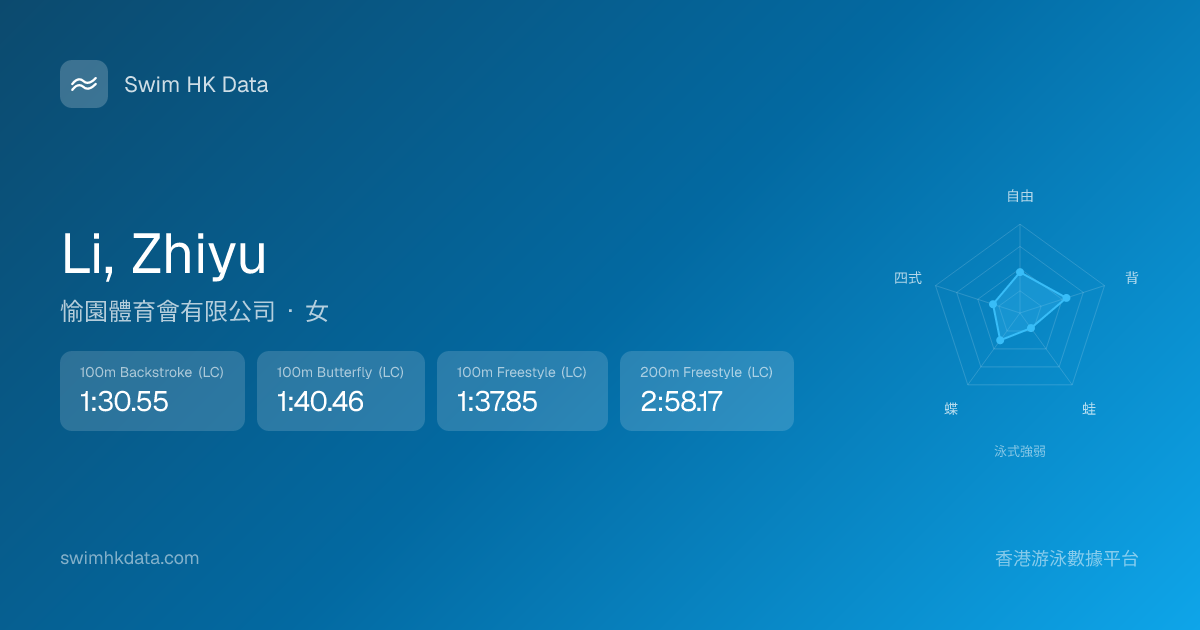 此圖表根據你所有比賽成績計算,顯示你在各泳式的相對強弱,僅供參考。繼續努力,每一次練習都會讓你更快更強!💪