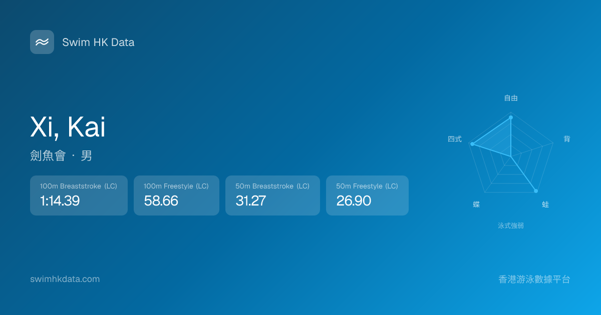 此圖表根據你所有比賽成績計算,顯示你在各泳式的相對強弱,僅供參考。繼續努力,每一次練習都會讓你更快更強!💪