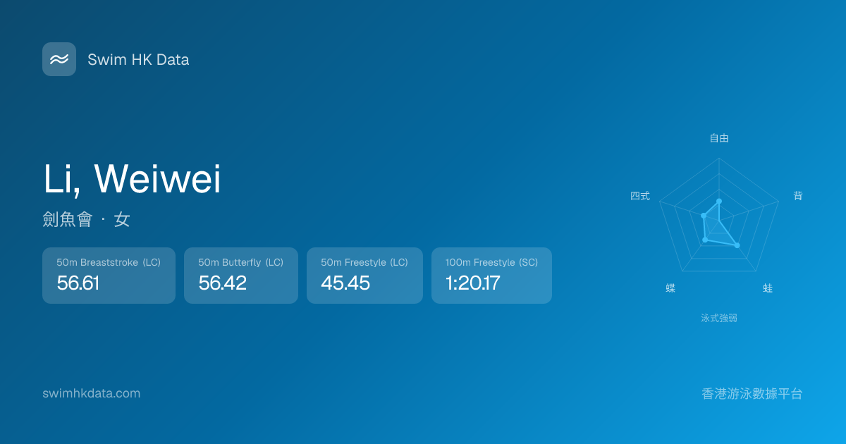 此圖表根據你所有比賽成績計算,顯示你在各泳式的相對強弱,僅供參考。繼續努力,每一次練習都會讓你更快更強!💪