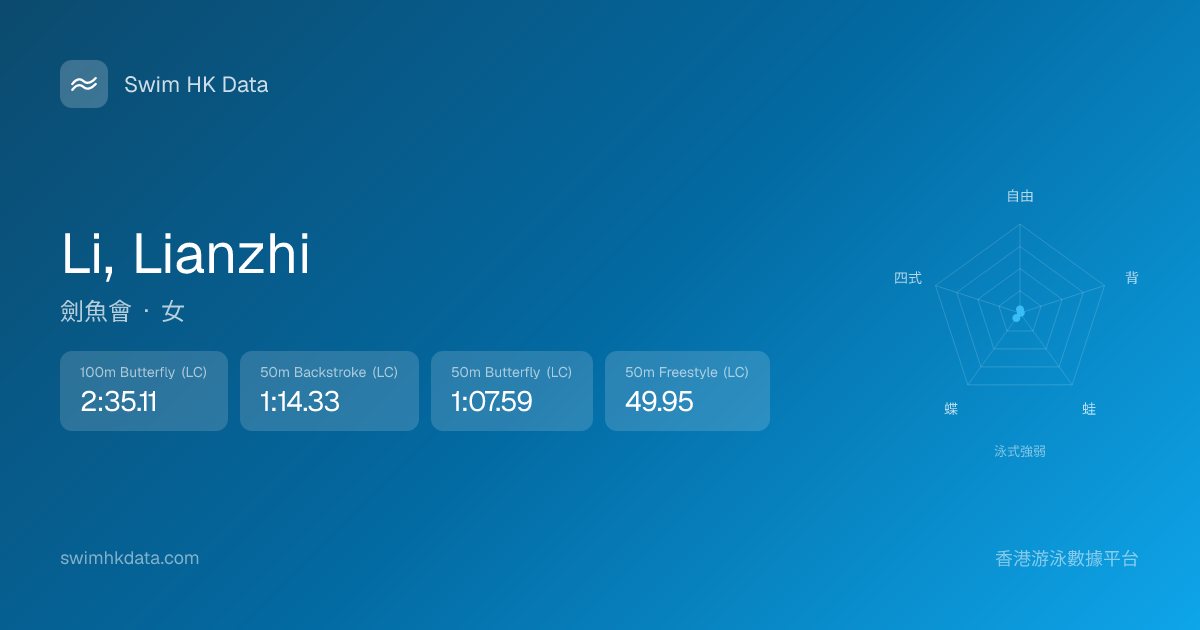 此圖表根據你所有比賽成績計算,顯示你在各泳式的相對強弱,僅供參考。繼續努力,每一次練習都會讓你更快更強!💪