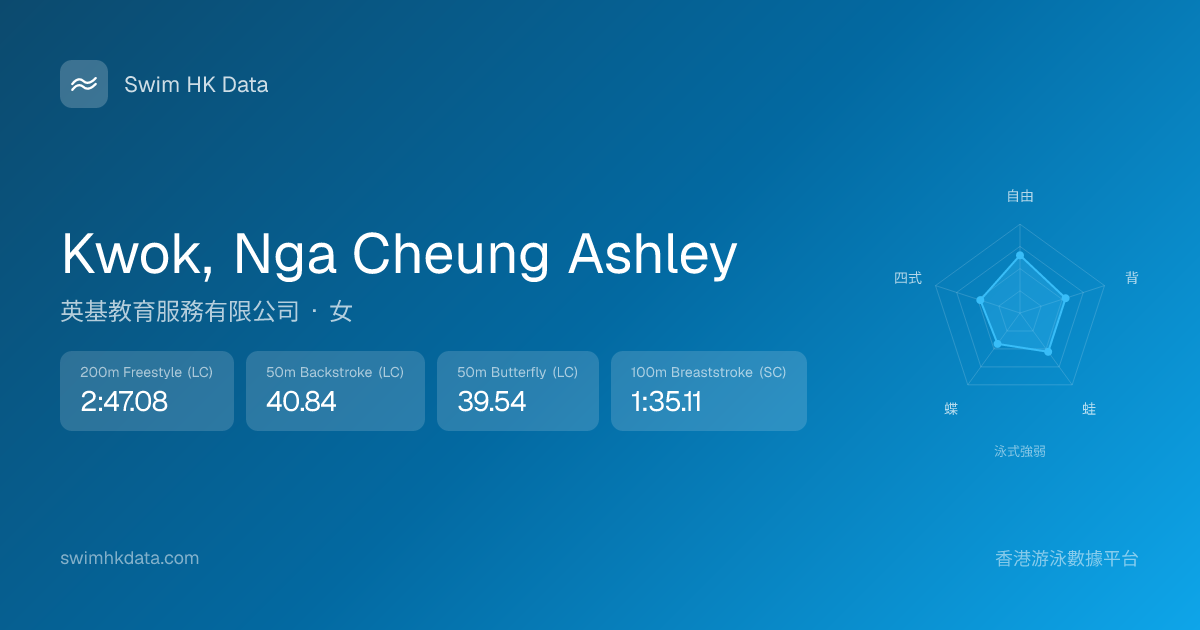 此圖表根據你所有比賽成績計算,顯示你在各泳式的相對強弱,僅供參考。繼續努力,每一次練習都會讓你更快更強!💪