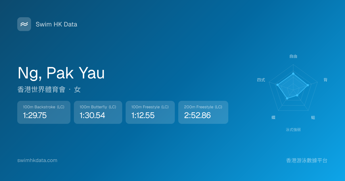 此圖表根據你所有比賽成績計算,顯示你在各泳式的相對強弱,僅供參考。繼續努力,每一次練習都會讓你更快更強!💪