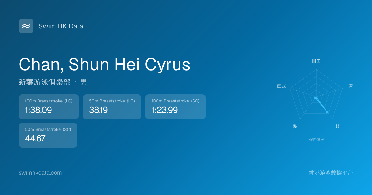 此圖表根據你所有比賽成績計算,顯示你在各泳式的相對強弱,僅供參考。繼續努力,每一次練習都會讓你更快更強!💪