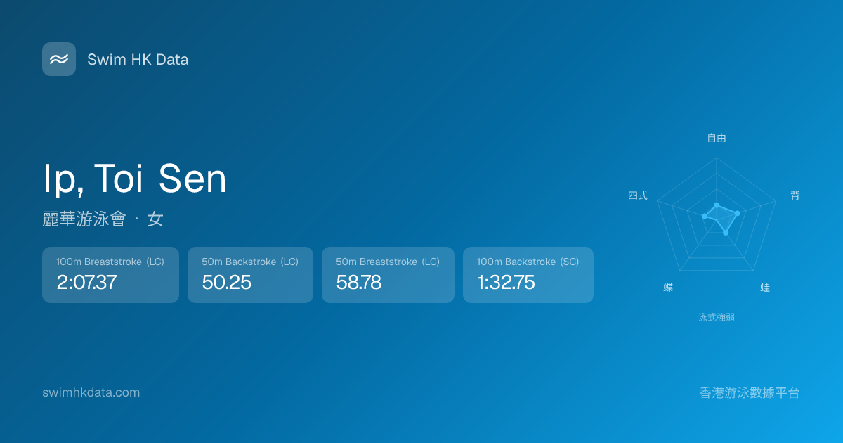 此圖表根據你所有比賽成績計算,顯示你在各泳式的相對強弱,僅供參考。繼續努力,每一次練習都會讓你更快更強!💪