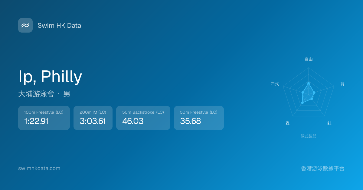 此圖表根據你所有比賽成績計算,顯示你在各泳式的相對強弱,僅供參考。繼續努力,每一次練習都會讓你更快更強!💪