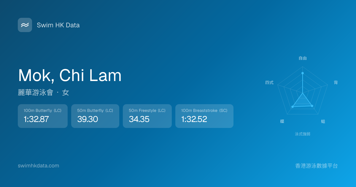 此圖表根據你所有比賽成績計算,顯示你在各泳式的相對強弱,僅供參考。繼續努力,每一次練習都會讓你更快更強!💪
