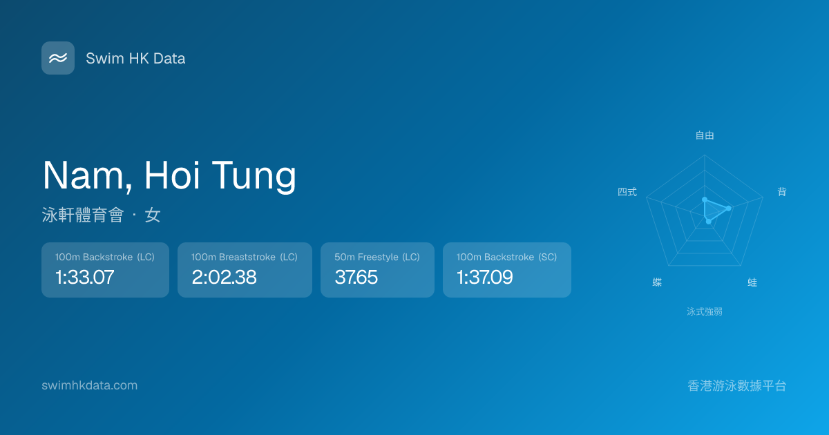 此圖表根據你所有比賽成績計算,顯示你在各泳式的相對強弱,僅供參考。繼續努力,每一次練習都會讓你更快更強!💪