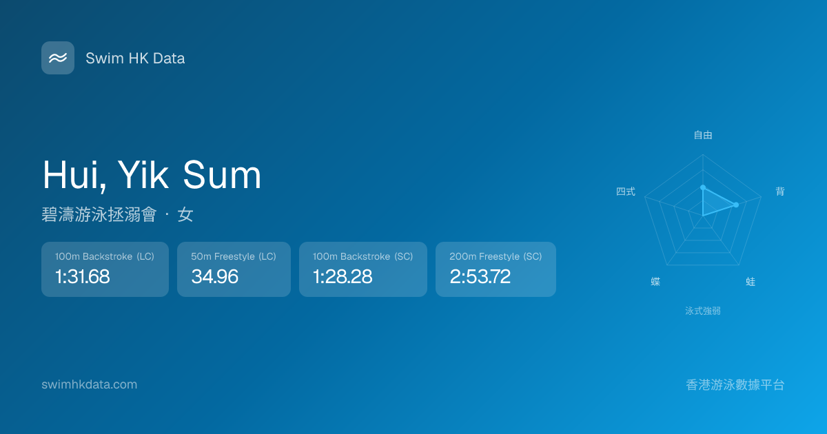 此圖表根據你所有比賽成績計算,顯示你在各泳式的相對強弱,僅供參考。繼續努力,每一次練習都會讓你更快更強!💪