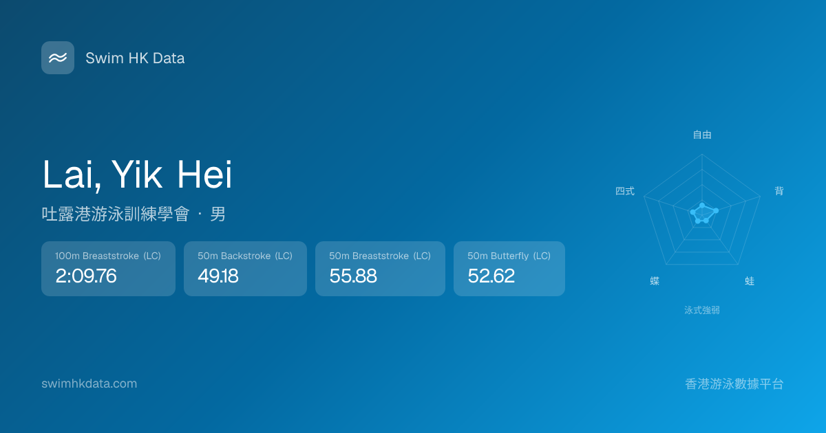 此圖表根據你所有比賽成績計算,顯示你在各泳式的相對強弱,僅供參考。繼續努力,每一次練習都會讓你更快更強!💪
