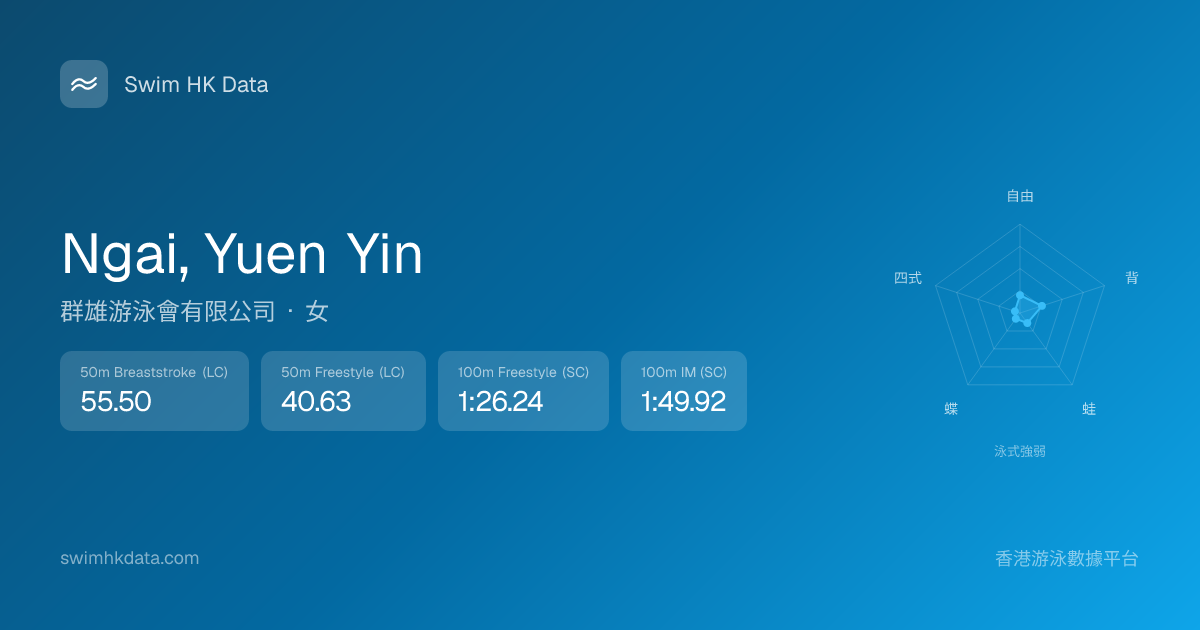此圖表根據你所有比賽成績計算,顯示你在各泳式的相對強弱,僅供參考。繼續努力,每一次練習都會讓你更快更強!💪
