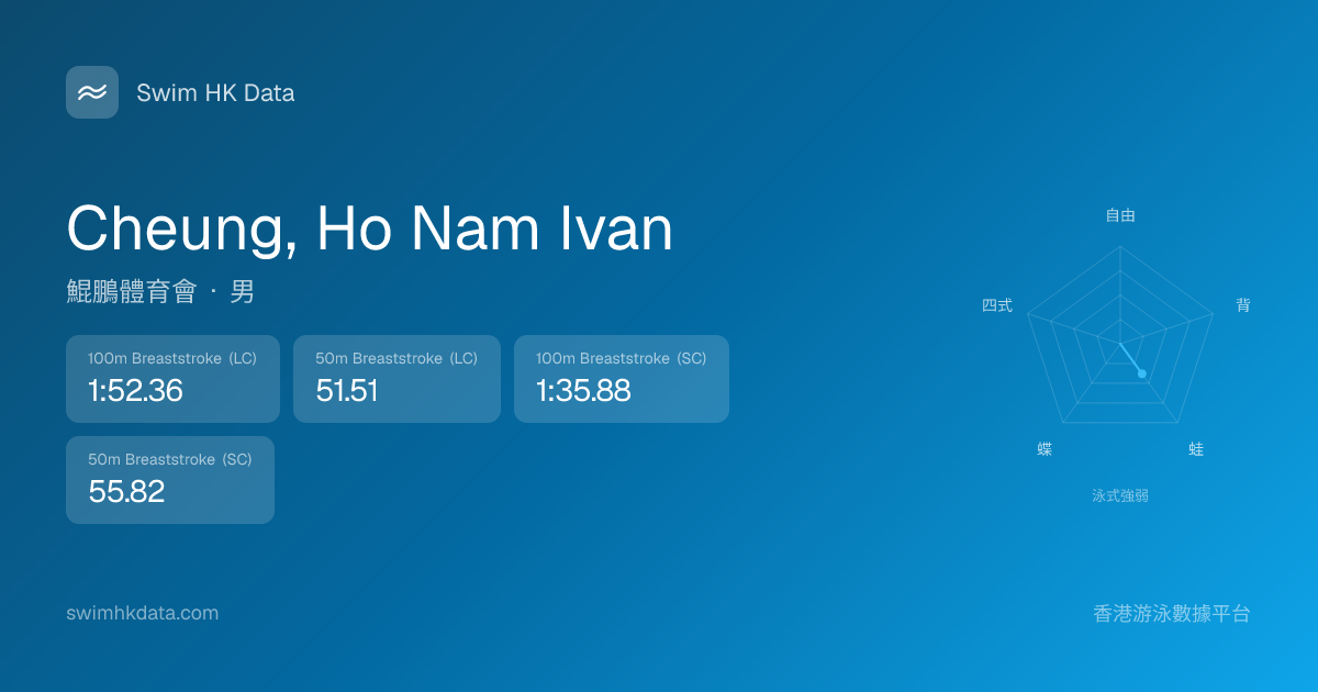 此圖表根據你所有比賽成績計算,顯示你在各泳式的相對強弱,僅供參考。繼續努力,每一次練習都會讓你更快更強!💪