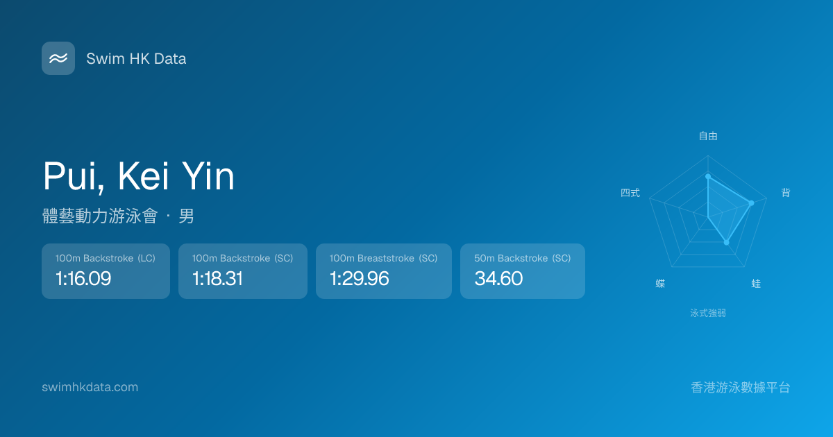 此圖表根據你所有比賽成績計算,顯示你在各泳式的相對強弱,僅供參考。繼續努力,每一次練習都會讓你更快更強!💪