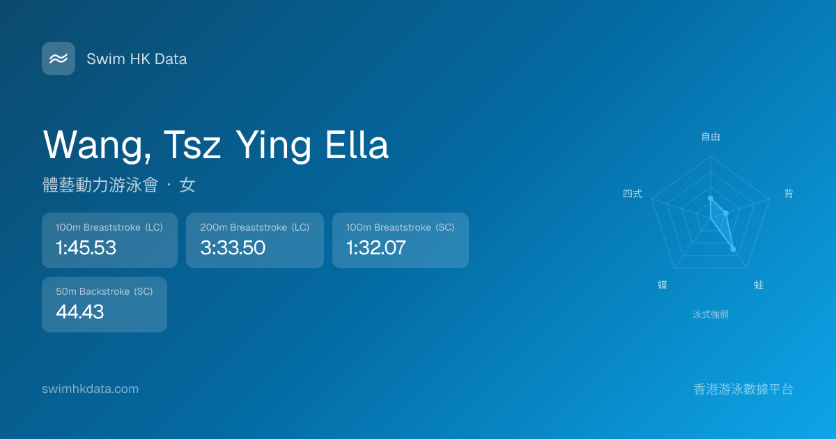 此圖表根據你所有比賽成績計算,顯示你在各泳式的相對強弱,僅供參考。繼續努力,每一次練習都會讓你更快更強!💪