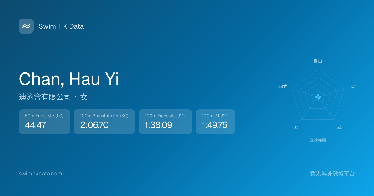 此圖表根據你所有比賽成績計算,顯示你在各泳式的相對強弱,僅供參考。繼續努力,每一次練習都會讓你更快更強!💪