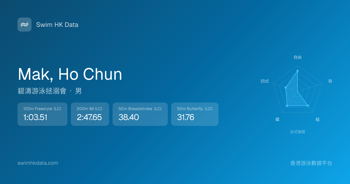 此圖表根據你所有比賽成績計算,顯示你在各泳式的相對強弱,僅供參考。繼續努力,每一次練習都會讓你更快更強!💪