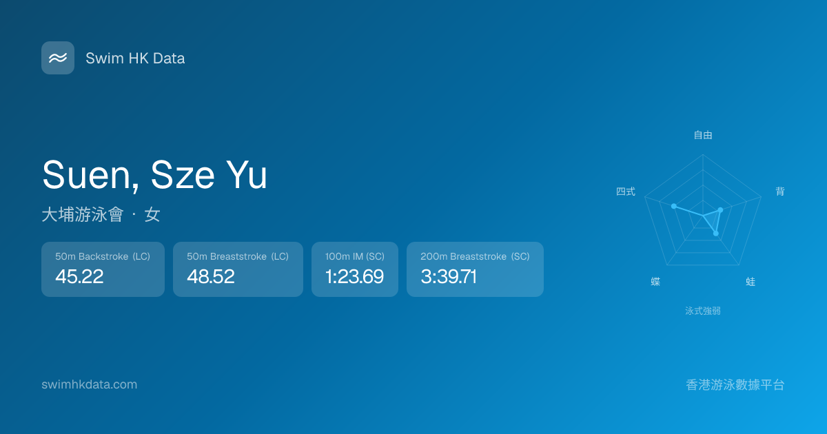 此圖表根據你所有比賽成績計算,顯示你在各泳式的相對強弱,僅供參考。繼續努力,每一次練習都會讓你更快更強!💪