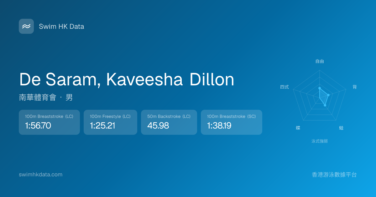 此圖表根據你所有比賽成績計算,顯示你在各泳式的相對強弱,僅供參考。繼續努力,每一次練習都會讓你更快更強!💪