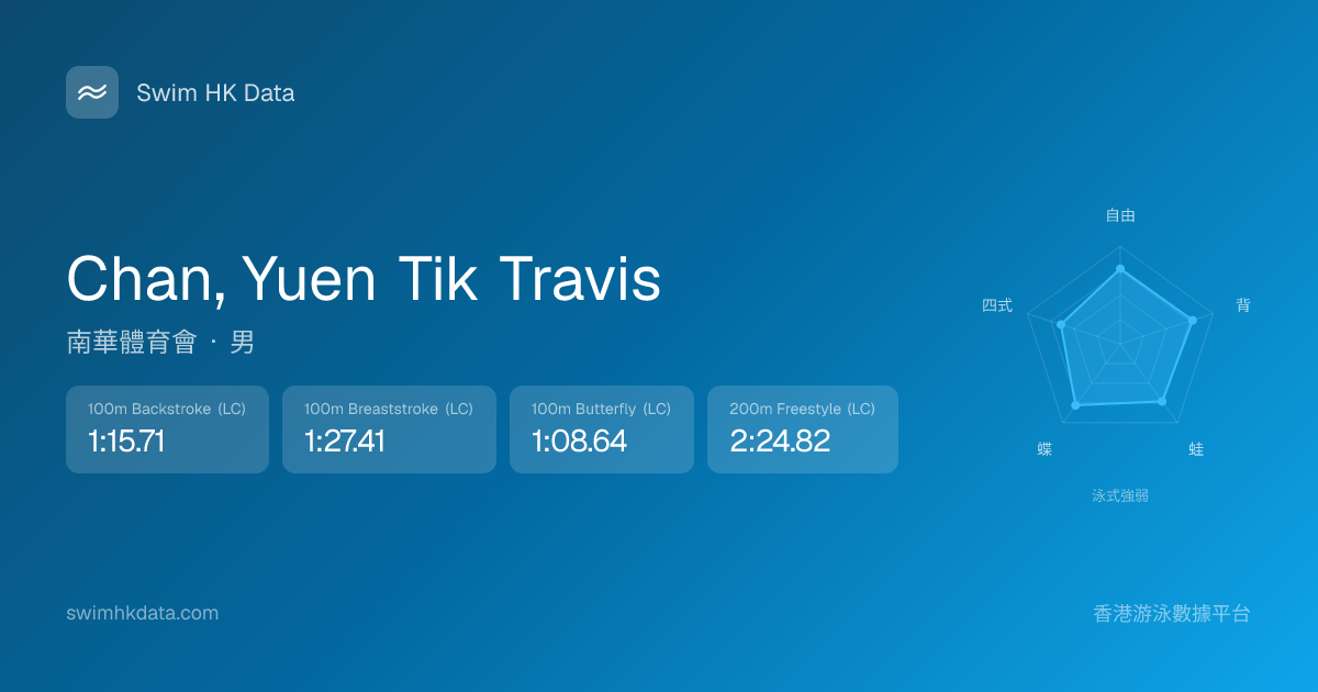 此圖表根據你所有比賽成績計算,顯示你在各泳式的相對強弱,僅供參考。繼續努力,每一次練習都會讓你更快更強!💪