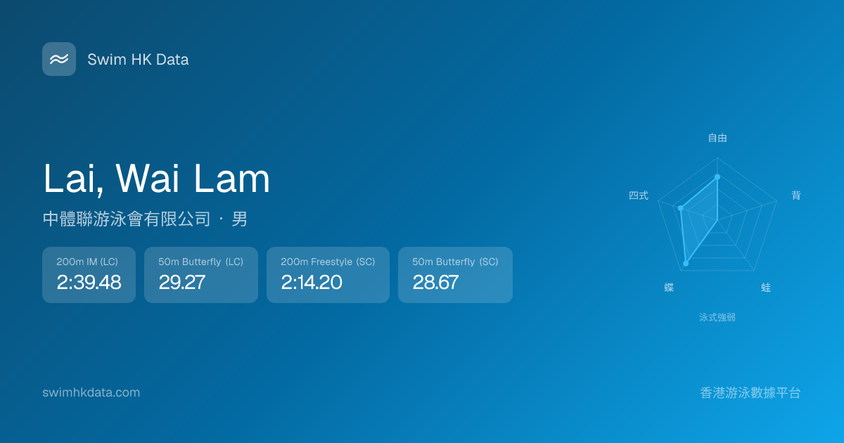 此圖表根據你所有比賽成績計算,顯示你在各泳式的相對強弱,僅供參考。繼續努力,每一次練習都會讓你更快更強!💪