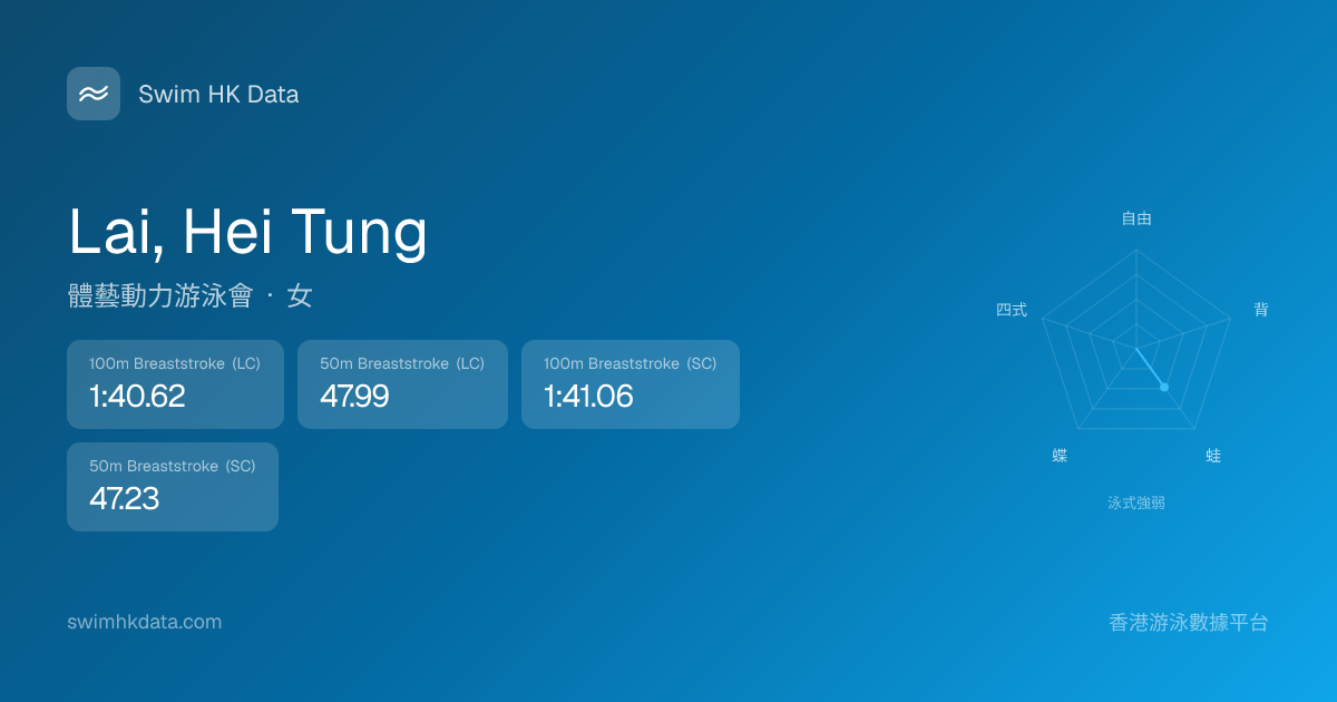此圖表根據你所有比賽成績計算,顯示你在各泳式的相對強弱,僅供參考。繼續努力,每一次練習都會讓你更快更強!💪