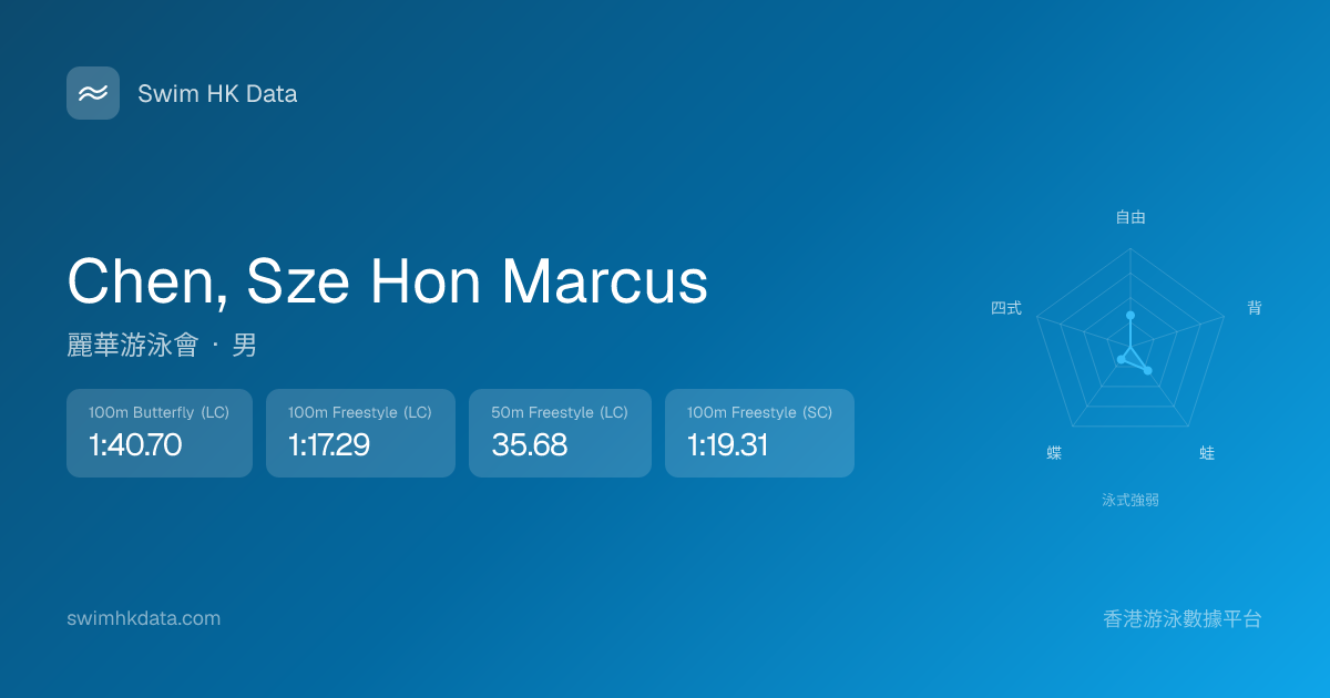 此圖表根據你所有比賽成績計算,顯示你在各泳式的相對強弱,僅供參考。繼續努力,每一次練習都會讓你更快更強!💪
