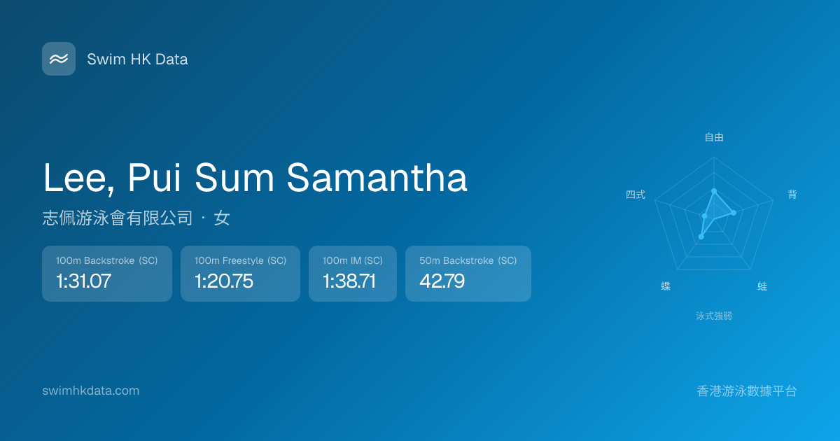 此圖表根據你所有比賽成績計算,顯示你在各泳式的相對強弱,僅供參考。繼續努力,每一次練習都會讓你更快更強!💪