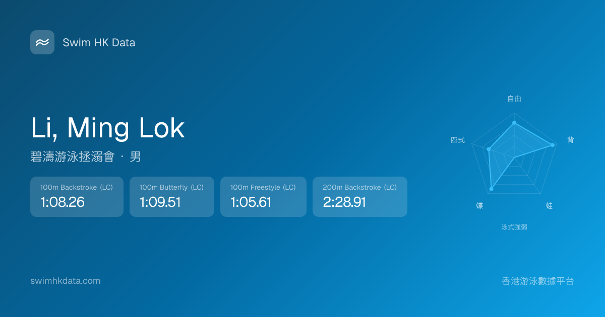 此圖表根據你所有比賽成績計算,顯示你在各泳式的相對強弱,僅供參考。繼續努力,每一次練習都會讓你更快更強!💪