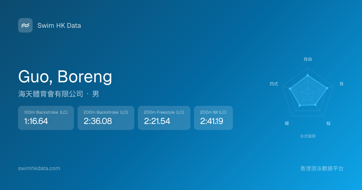 此圖表根據你所有比賽成績計算,顯示你在各泳式的相對強弱,僅供參考。繼續努力,每一次練習都會讓你更快更強!💪