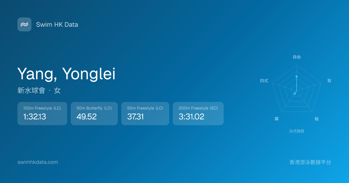 此圖表根據你所有比賽成績計算,顯示你在各泳式的相對強弱,僅供參考。繼續努力,每一次練習都會讓你更快更強!💪
