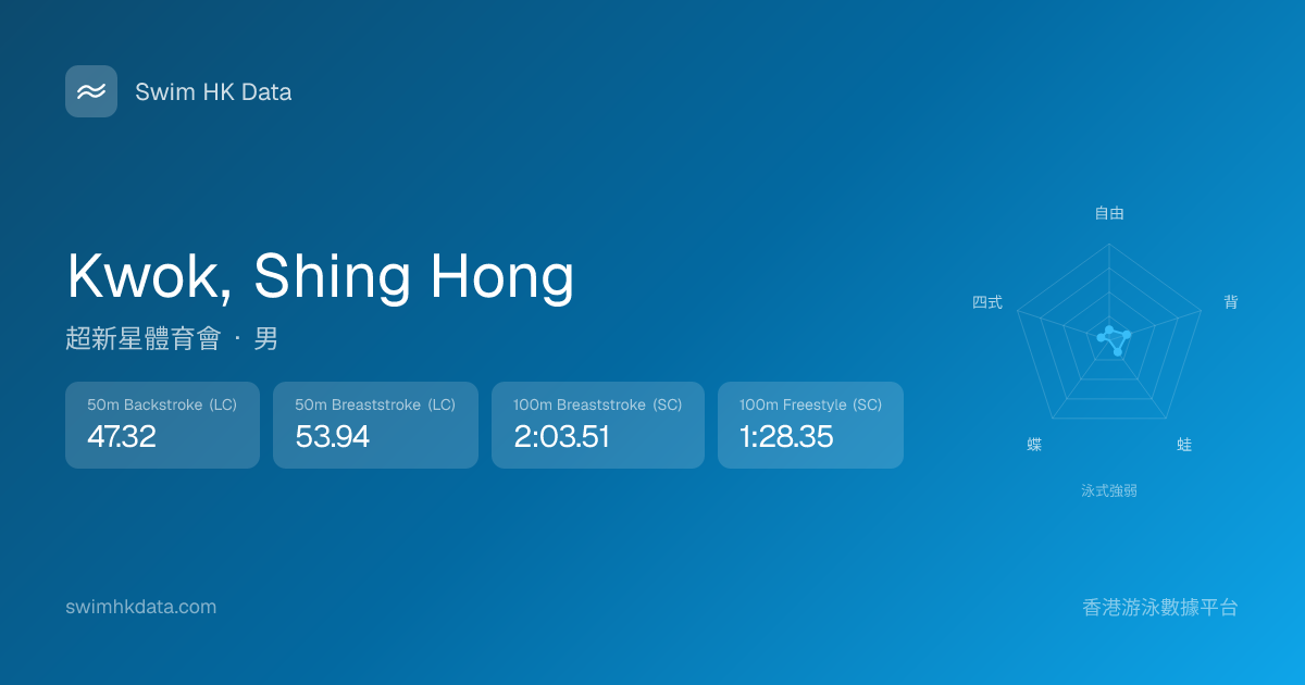 此圖表根據你所有比賽成績計算,顯示你在各泳式的相對強弱,僅供參考。繼續努力,每一次練習都會讓你更快更強!💪
