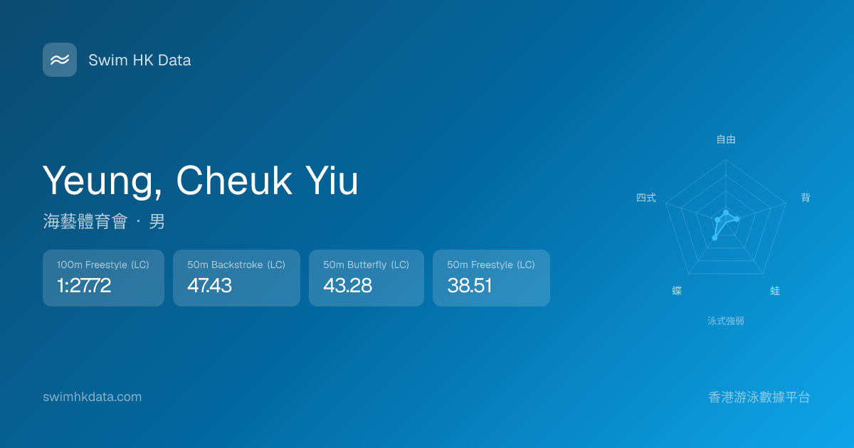此圖表根據你所有比賽成績計算,顯示你在各泳式的相對強弱,僅供參考。繼續努力,每一次練習都會讓你更快更強!💪