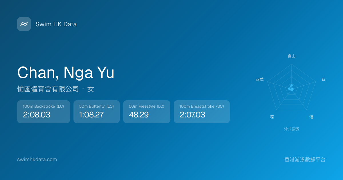 此圖表根據你所有比賽成績計算,顯示你在各泳式的相對強弱,僅供參考。繼續努力,每一次練習都會讓你更快更強!💪