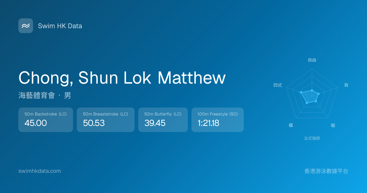 此圖表根據你所有比賽成績計算,顯示你在各泳式的相對強弱,僅供參考。繼續努力,每一次練習都會讓你更快更強!💪