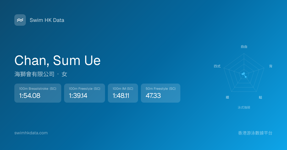 此圖表根據你所有比賽成績計算,顯示你在各泳式的相對強弱,僅供參考。繼續努力,每一次練習都會讓你更快更強!💪