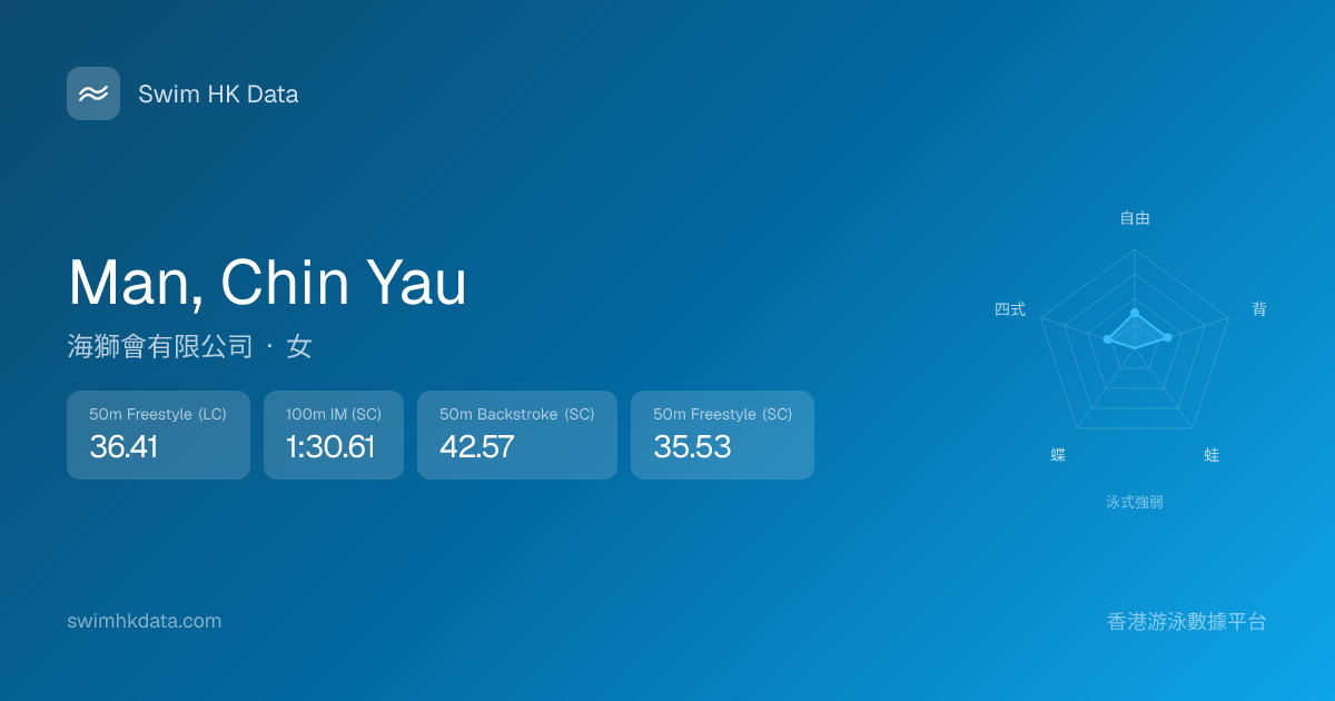 此圖表根據你所有比賽成績計算,顯示你在各泳式的相對強弱,僅供參考。繼續努力,每一次練習都會讓你更快更強!💪