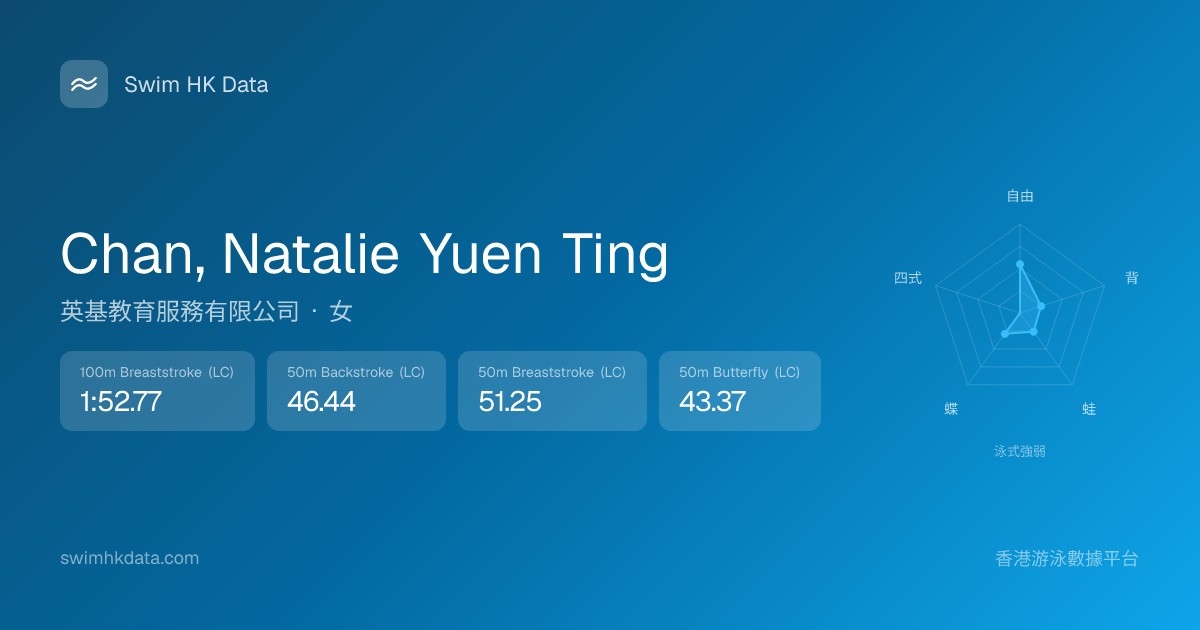 此圖表根據你所有比賽成績計算,顯示你在各泳式的相對強弱,僅供參考。繼續努力,每一次練習都會讓你更快更強!💪