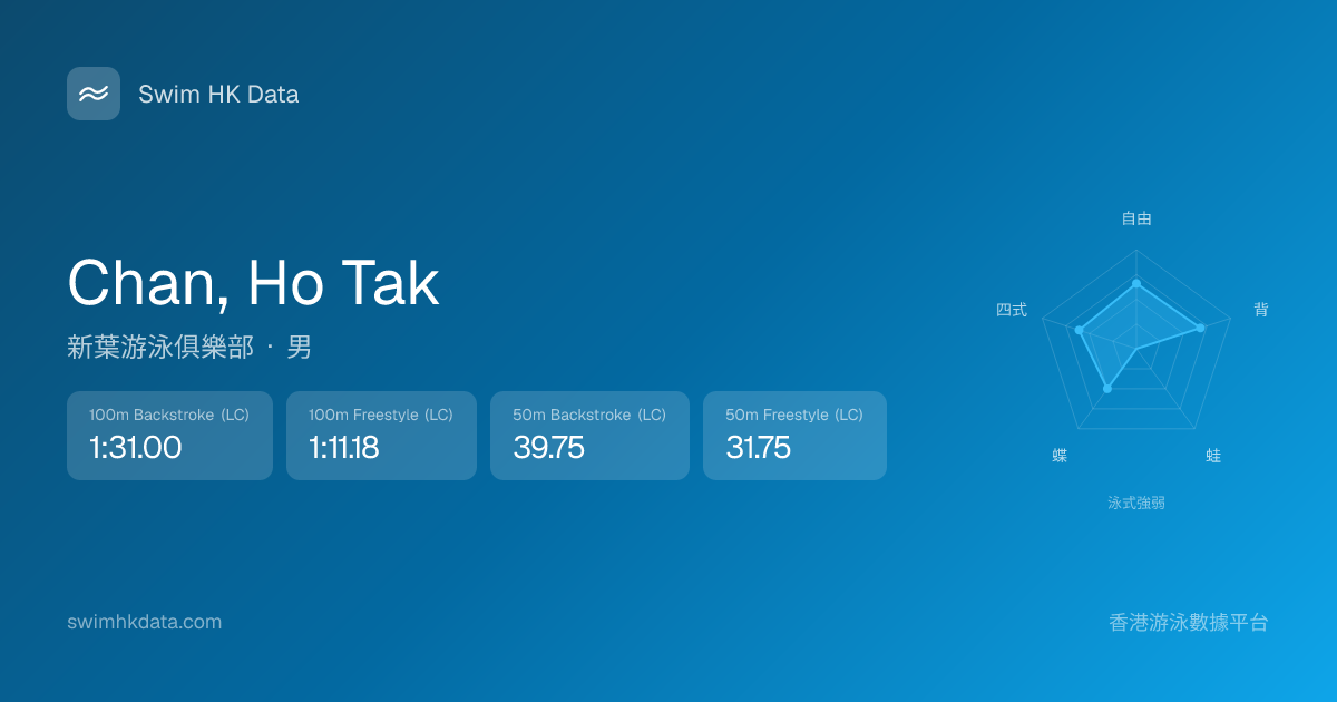 此圖表根據你所有比賽成績計算,顯示你在各泳式的相對強弱,僅供參考。繼續努力,每一次練習都會讓你更快更強!💪
