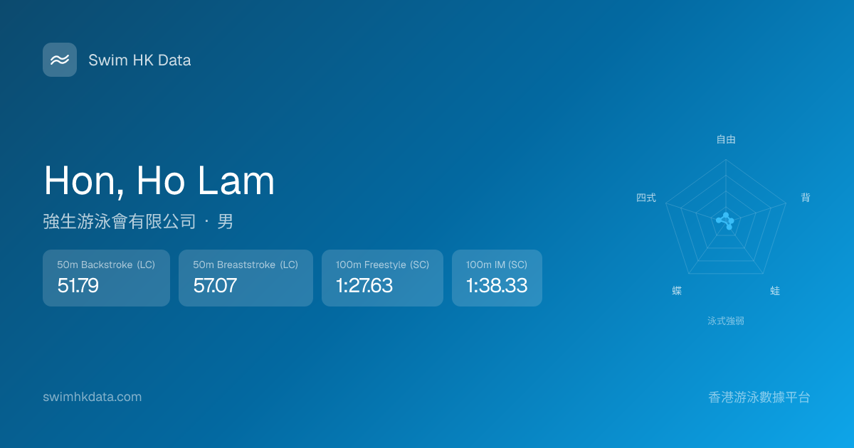 此圖表根據你所有比賽成績計算,顯示你在各泳式的相對強弱,僅供參考。繼續努力,每一次練習都會讓你更快更強!💪