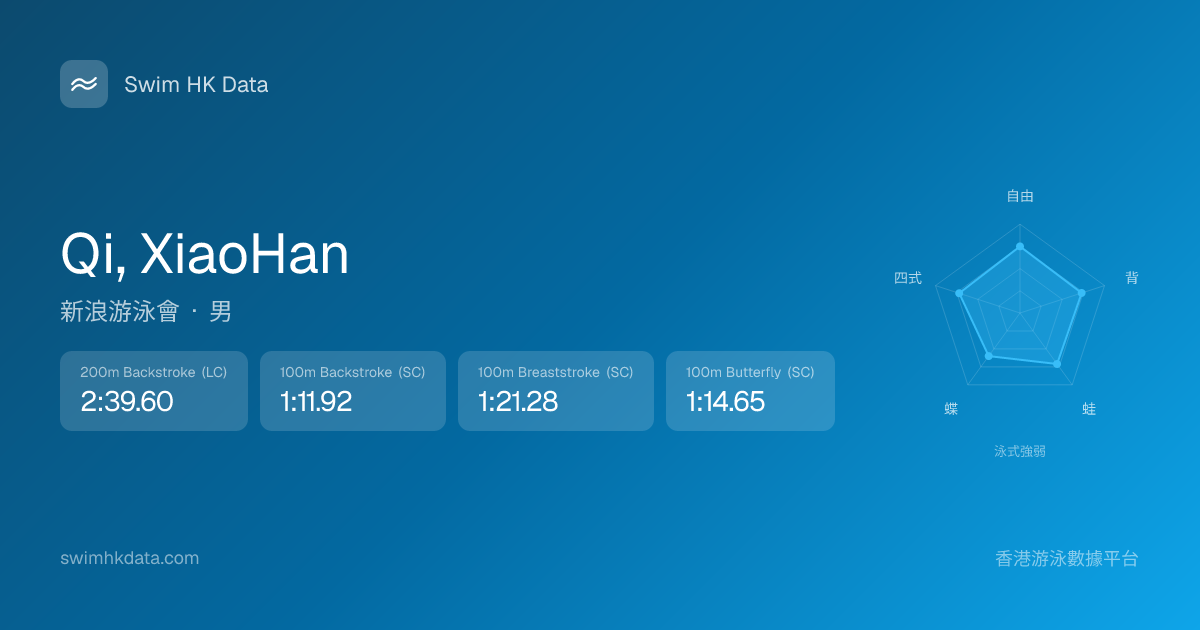 此圖表根據你所有比賽成績計算,顯示你在各泳式的相對強弱,僅供參考。繼續努力,每一次練習都會讓你更快更強!💪