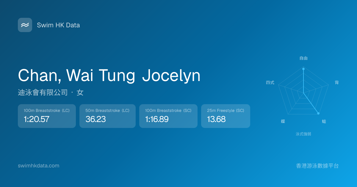 此圖表根據你所有比賽成績計算,顯示你在各泳式的相對強弱,僅供參考。繼續努力,每一次練習都會讓你更快更強!💪