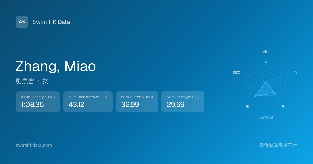 此圖表根據你所有比賽成績計算,顯示你在各泳式的相對強弱,僅供參考。繼續努力,每一次練習都會讓你更快更強!💪