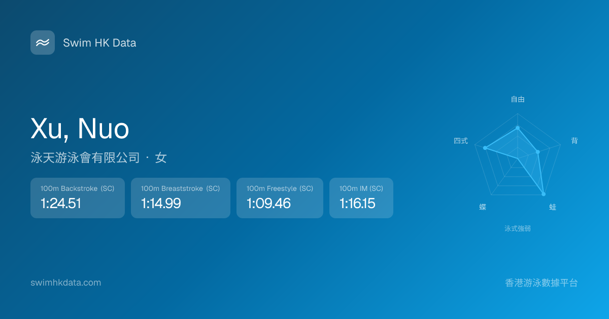 此圖表根據你所有比賽成績計算,顯示你在各泳式的相對強弱,僅供參考。繼續努力,每一次練習都會讓你更快更強!💪