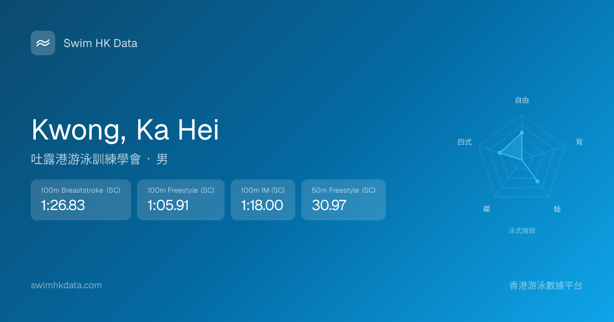 此圖表根據你所有比賽成績計算,顯示你在各泳式的相對強弱,僅供參考。繼續努力,每一次練習都會讓你更快更強!💪