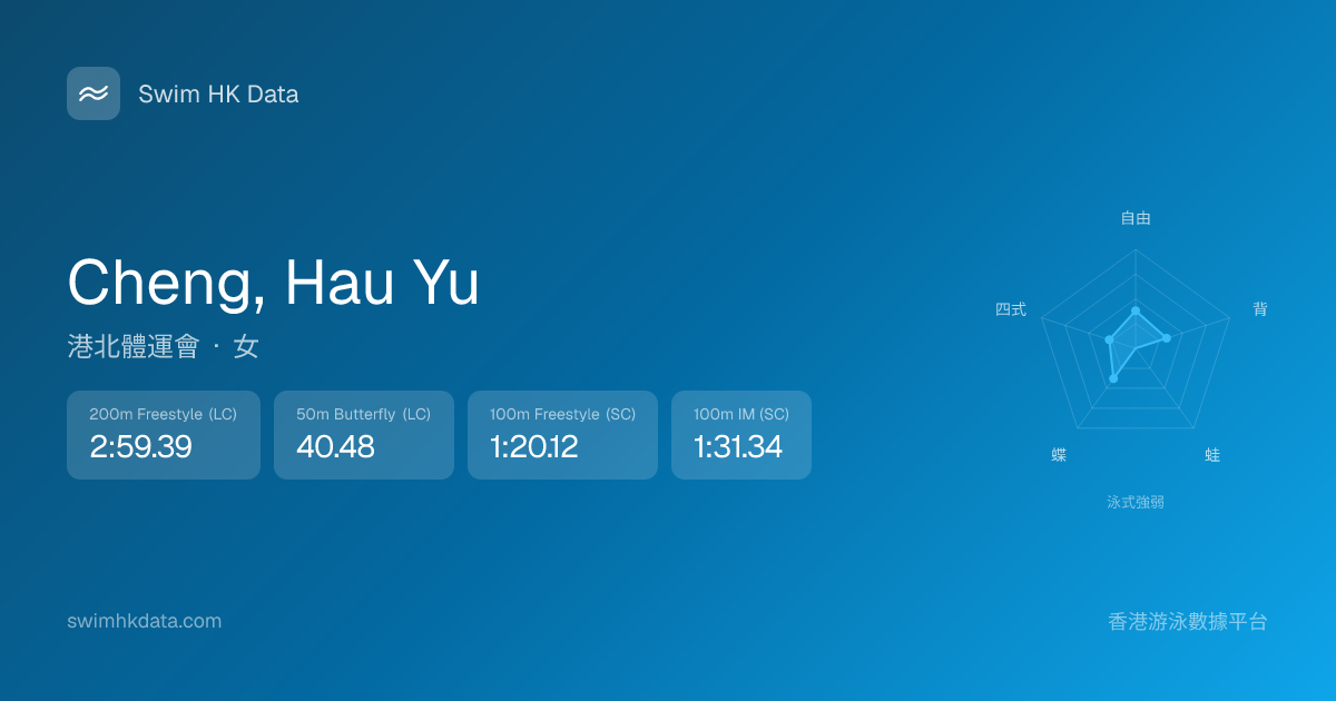 此圖表根據你所有比賽成績計算,顯示你在各泳式的相對強弱,僅供參考。繼續努力,每一次練習都會讓你更快更強!💪